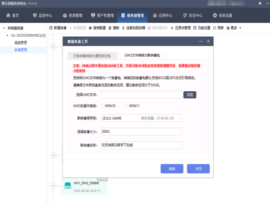 保存ini后,重新打开管理端,映像管理 ,更多 -打开通用包转换工具,即可看到GHO转换功能;